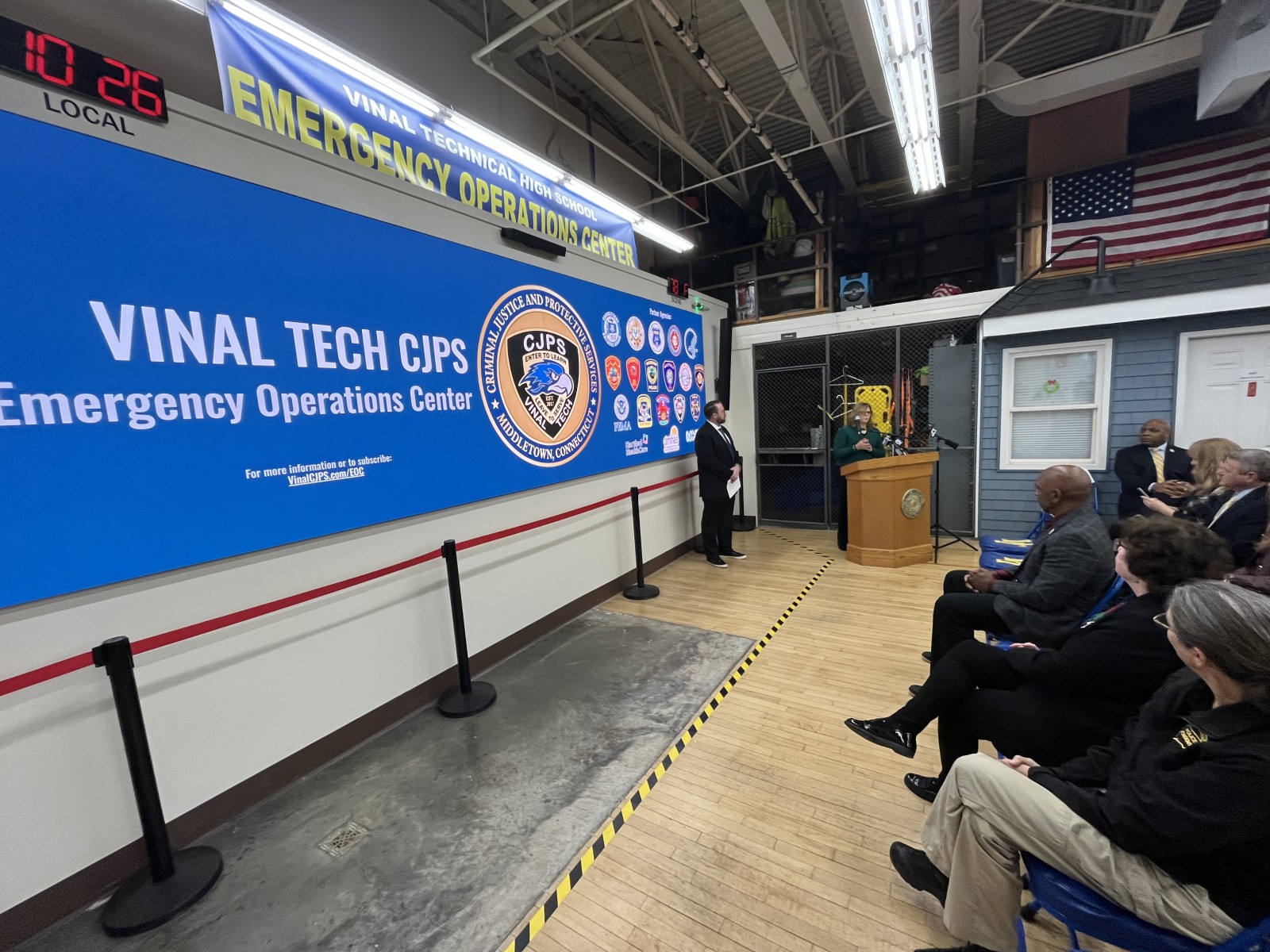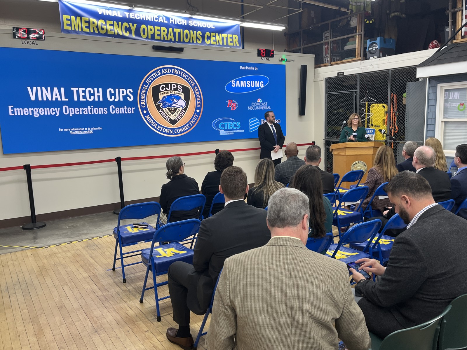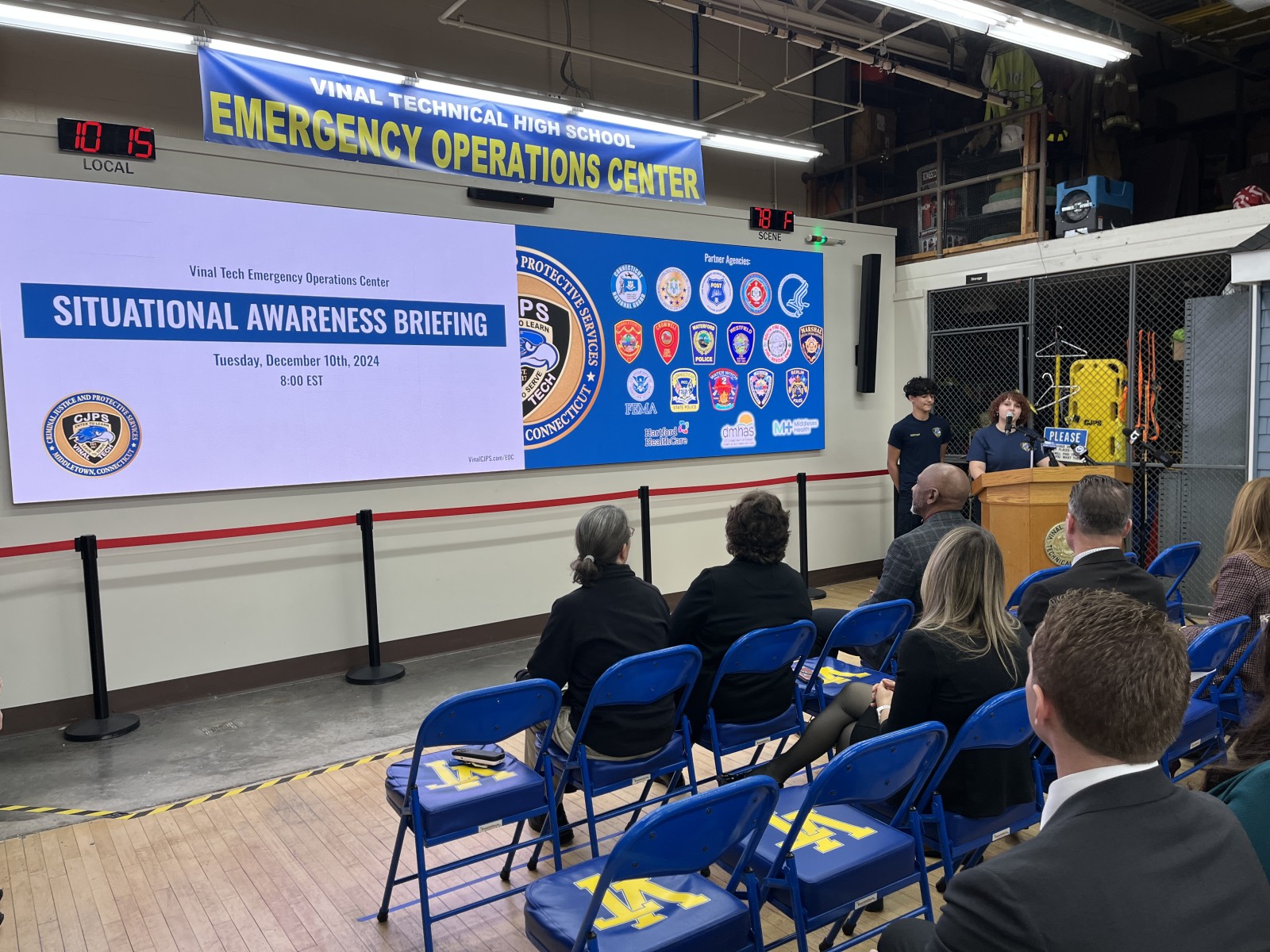 Middletown, CT — December 10, 2024 – Vinal Technical High School’s Criminal Justice and Protective Services (CJPS) Program hosted a landmark event today, unveiling a $300,000 upgrade to its Emergency Operations Center (EOC), made possible by Samsung, Comcast, and RnB Enterprises. The event also marked the debut of a groundbreaking initiative: a free, student-developed 365-day-per-year intelligence briefing for first responders nationwide.